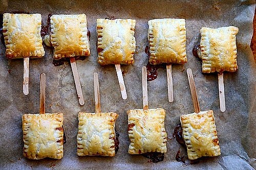 Oda ısında yumuşamış milföylerin 4 adedini yağlı kağıt serili fırın tepsisine alın. Üzerlerine çikolatalı fındık kreması veya marmelat sürün. Çubukları milföylerin alt kısımlarına koyun. Kalan 4 milföy yaprağı ile üzerlerini kapayın. Çatal yardımıyla tüm kenarlarını yeterlice yapıştırın. Üzerlerine yumurta sarısını sürün. 180 derece fırında üzerleri kızarana kadar pişirin.