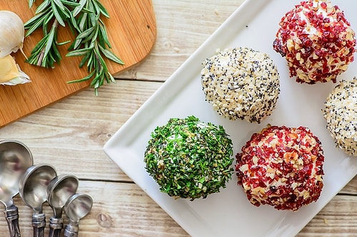 Tüm peynirleri karıştırın ve güzelce ezin. Karıştırdığınız karışımdan eliniz ile ceviz büyüklüğünde kesimler koparıp, yuvarlayın. Yuvarladığımız peynir toplarını başka ayrı baharatlara bulayıp, servis tabağına dizin.