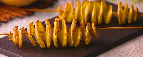 Patatesin ortasından çubuklu geçirin. Keskin bir bıçakla en uçtan başlayarak yavaş yavaş spiral kesin. Dilimlenen patatesleri yavaşça ayırın. Sıvı yağ, tuz ve karabiberi karıştırın. Patatesleri bu yağ ile kaplayın ve fırın tepsisine dizin. Evvelce ısıtılmış 200 derece fırında kızartın.