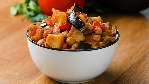 Patlıcanı yıkayıp alacalı soyun. Acısının çıkması için 10 dakika tuzlu suda bekletin. Akabinde patlıcan, patates ve domatesleri küp küp doğrayın. Zeytinyağı döktüğünüz tavaya patates ve patlıcanları ekleyerek kavurun. Akabinde domatesleri ekleyin ve karıştırın. Tuz ve baharatları ekleyip karıştırın ve