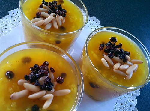 Pirinci yıkayın. Yıkadıktan ve süzüldükten sonra, pirinci büyük bir tencereye koyun. Üzerine su ekleyin ve yaklaşık 20 dakika kadar pişirin. Başka bir tencereye 4 bardak suyu koyun. Safranı ekleyin ve yaklaşık 15 dakika bekletin. Yumuşadıktan sonra, safranı ezmek ve sarı rengi ortaya çıkarmak için tahta bir kaşığın kenarını kullanın. Safranlı suya pişmiş pirinci, şekeri, zerdeçalı ekleyin ve kaynatın. Gül suyunu ve mısır nişastasını ekleyin ve puding kıvamına gelene kadar yaklaşık 20 dakika daima karıştırarak pişirin. Servis kaselerine dökün ve soğumaya bırakın. Servis ederken çam fıstığı ve kuş üzümü ile süsleyin. Süslemek için tıpkı vakitte nar, fındık, ceviz üzere alternatifler de kullanabilirsiniz.
